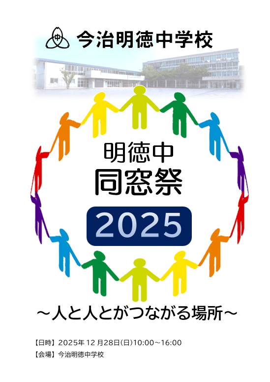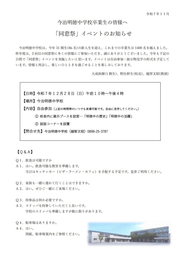 卒業生の皆様へ「同窓祭」のお知らせ 2025年11月11日 最終更新日時 : 2025年11月11日 mai0601su 今治明徳中学校卒業生の皆様へ今年度も年末に「同窓祭」を実施いたします。詳細は以下の画像の内容をご参照ください。