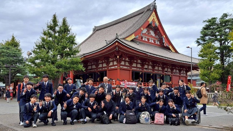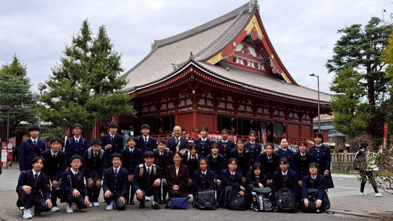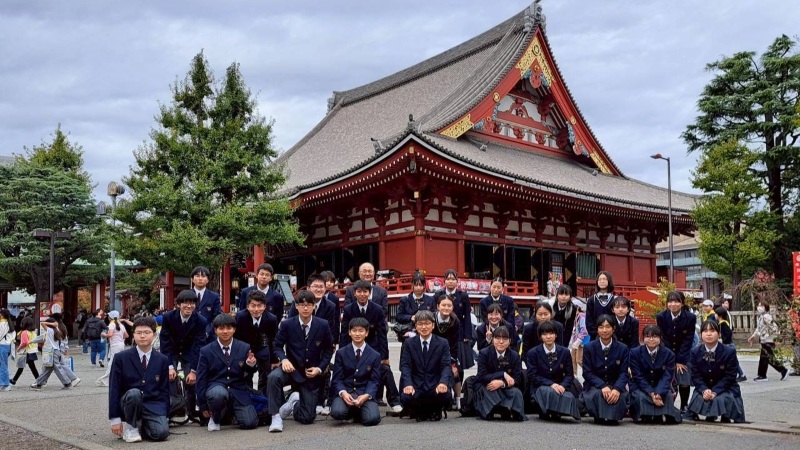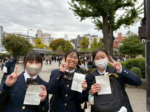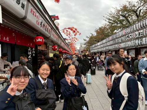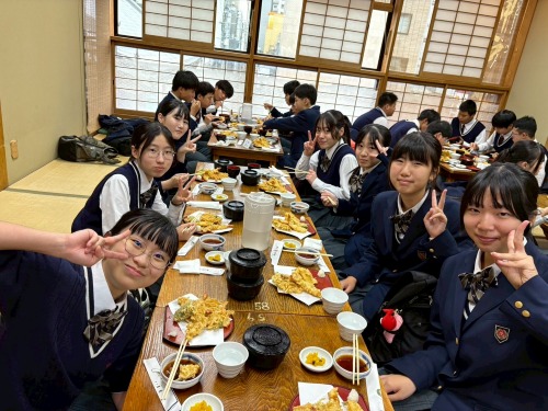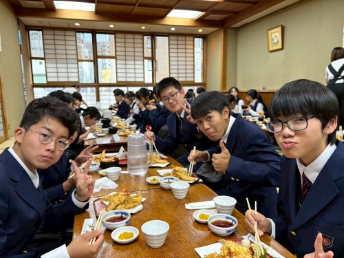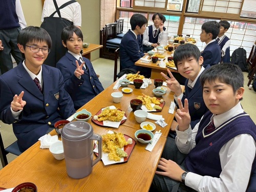 浅草の雷門がすぐ目の前です。生徒たちは、天ぷら定食をしっかり食べることができました。