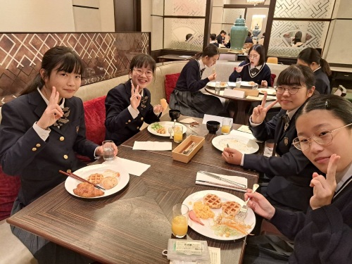 2年生 修学旅行2日目⑤ 2025年11月12日 最終更新日時 : 2025年11月13日 mai0601su 11月12日(水)、2日目の朝を迎えました。天候は晴れ、生徒たちも今日は気合が入っていてみんな早起きです。ヒルトン東京ベイで、ビュッフェ形式の朝食をしっかり食べることができました。待ちに待ったディズニーランドで楽しんできます。