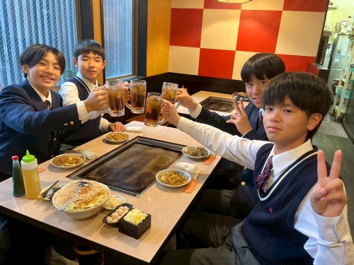 昼食は東京名物「もんじゃ焼き」でした。クラスごとに3件の店でいただきました。