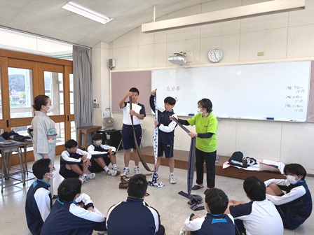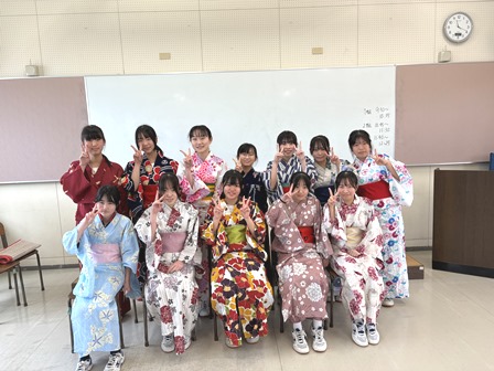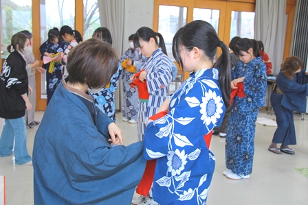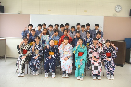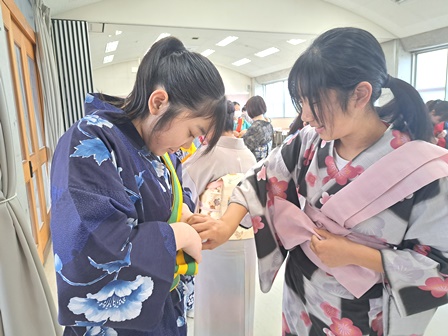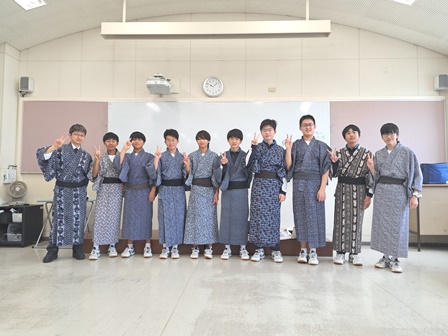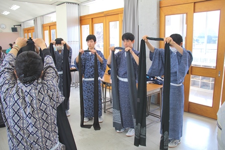 2年生 着付け体験講座 2026年3月6日 最終更新日時 : 2026年3月6日 mai0601su 3月4日(水)2階ホールにて、市内在住の和服着付け講師の方をお招きして、和服の着付け体験講座を行いました。 生徒たちは、和服についての話を聞き、ゆかたを着てみる体験を通して、日本の着物の特徴を感じたり興味・関心を持つことができました。